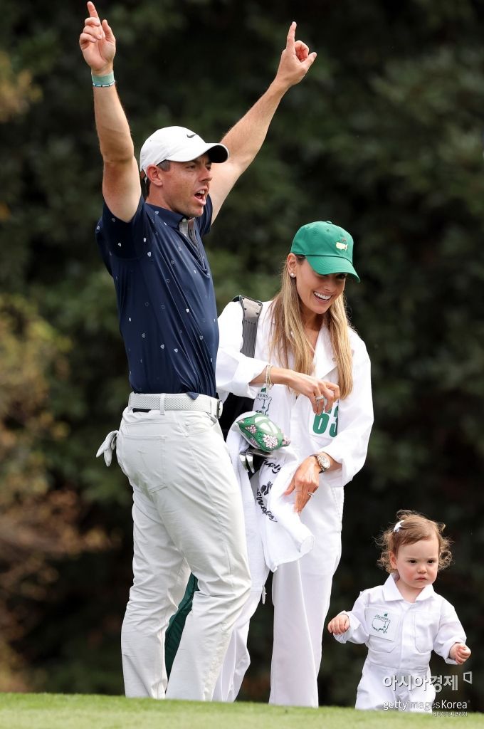 로리 매킬로이(북아일랜드)가 7일 오전(한국시간) 미국 조지아주 오거스타내셔널골프장(파72ㆍ7510야드)에서 열린 ‘명인열전’ 마스터스 ‘파3 콘테스트’에서 환호하고 있다. 아내 에리카 스톨, 딸 포피와 함께 해 더욱 신난 모습이다. 매킬로이는 올해 마스터스에서 우승을 할 경우 지구촌 골프역사상 서로 다른 4개 메이저를 석권하는 여섯번째 ‘커리어 그랜드슬래머’에 등극한다.