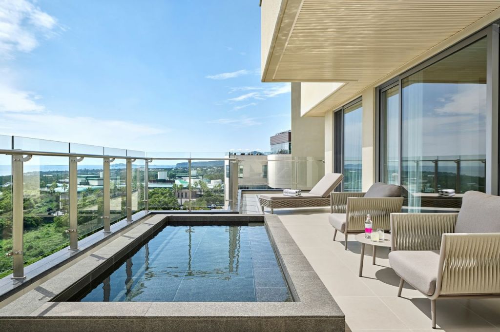 그랜드 조선 제주의 힐 스위트관은 전 객실 50개 모두 스위트 객실로 구성됐다. '프레스티지 힐 스위트'는 힐 스위트관 내 193.1㎡ 규모의 최상급 객실로 4인부터 최대 8인까지 투숙이 가능하다. 두 개의 침실과 거실, 별도의 응접실이 준비됐다. 야외 발코니에 마련된 프라이빗 풀도 이용 가능하다.