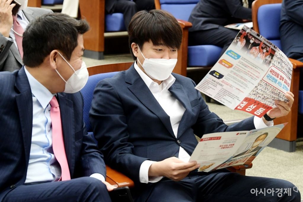 이준석 국민의힘 대표가 8일 오전 서울 여의도 국회에서 열린 국민의힘 2022 원내대표 선출 의원총회에서 후보들의 공약이 담긴 홍보 자료를 살펴보고 있다./국회사진기자단