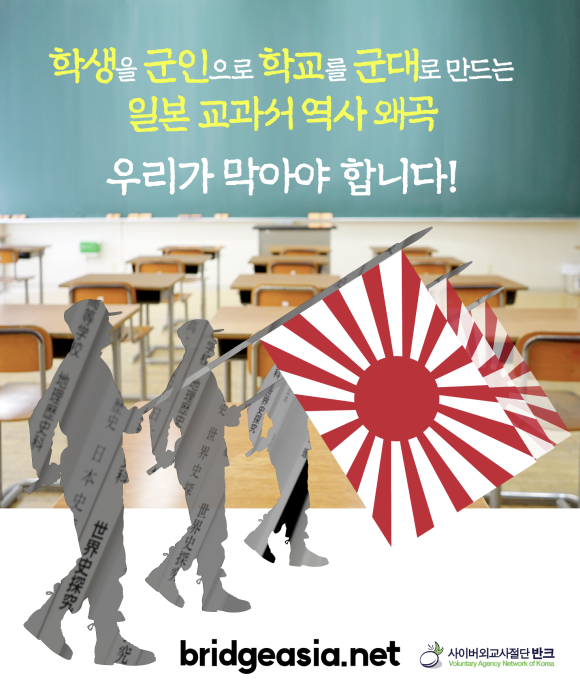 그러면서 이러한 일본의 역사 왜곡을 국제사회에 고발하는 포스터를 제작해 공개했다. '학생을 군인으로, 학교를 군대로 만드는 일본 교과서 역사 왜곡, 우리가 막아야 합니다'라는 제목의 포스터에는 고등학교 교실을 배경으로 욱일기 깃발을 든 군인이 등장한다.