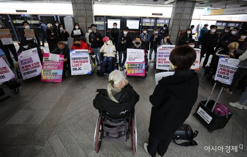 전국장애인차별철폐연대 관계자들이 3월24일 서울 지하철 3호선 경복궁역에서 장애인 이동권 보장 등을 요구하며 승차 시위를 벌이고 있다./김현민 기자 kimhyun81@