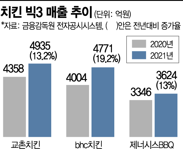 [아시아경제 문혜원 기자] 국내 치킨 프랜차이즈 ‘빅3’가 지난해 사상 최대 실적을 냈다. 코로나19 장기화로 인한 배달 특수 영향이 컸던 것으로 분석된다. 15일 업계에 따르면 교촌치킨, bhc치킨, 제너시스BBQ 등 3사의 지난해 매출 합산액은 1조3330억원에 달한다. 전년보다 12.7% 증가한 수치다.