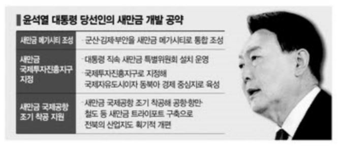 앞서 윤 당선인은 대선 후보 시절 "전북의 미래는 새만금에 달려있다고 해도 과언이 아니다"며 "새만금을 시작으로 다양한 지역 현안 사업을 꼼꼼히 챙기겠다"고 약속한 바 있다. 새만금은 전북의 젖줄이자 대한민국 제1의 미래성장 동력이라는 게 윤 당선인의 생각으로 선대위 당시부터 새만금 특위를 마련했다.