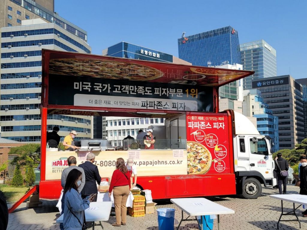 파파존스 피자가 지난 17일 서울시 중구 명동성당 인근에 매직카(피자 트럭)를 설치해 현장에 참석한 고객들을 대상으로 즉석에서 만든 따뜻한 피자(수퍼 파파스) 100판을 판매하고 있다.