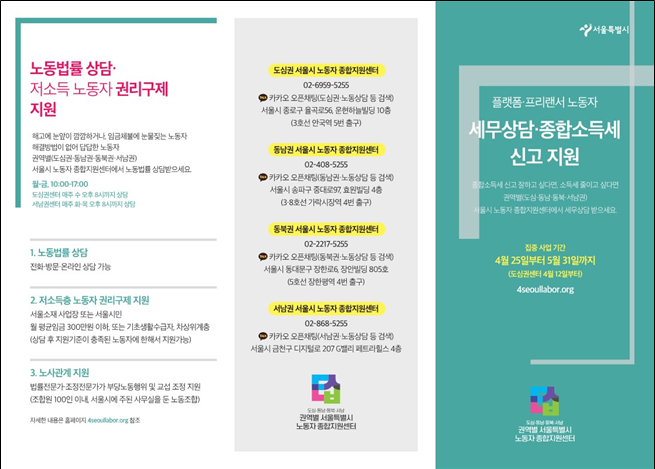 상담을 원하는 플랫폼·프리랜서 노동자는 가까운 서울시 노동자종합지원센터(4곳)를 방문하면 상세한 상담을 받을 수 있으며, 방문이 어려운 경우에는 전화, 홈페이지, 카카오톡 오픈채팅을 통해서도 가능하다.