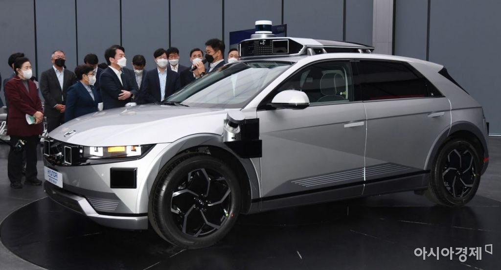 안철수 대통령직위원회 위원장과 정의선 현대자동차그룹 회장, 인수위 경제1분과 위원 등이 8일 경기도 화성 소재 현대자동차·기아 기술연구소 현대디자인동에서 아이오닉5 전기차 로보택시에 대한 설명을 듣고 있다./김현민 기자 kimhyun81@