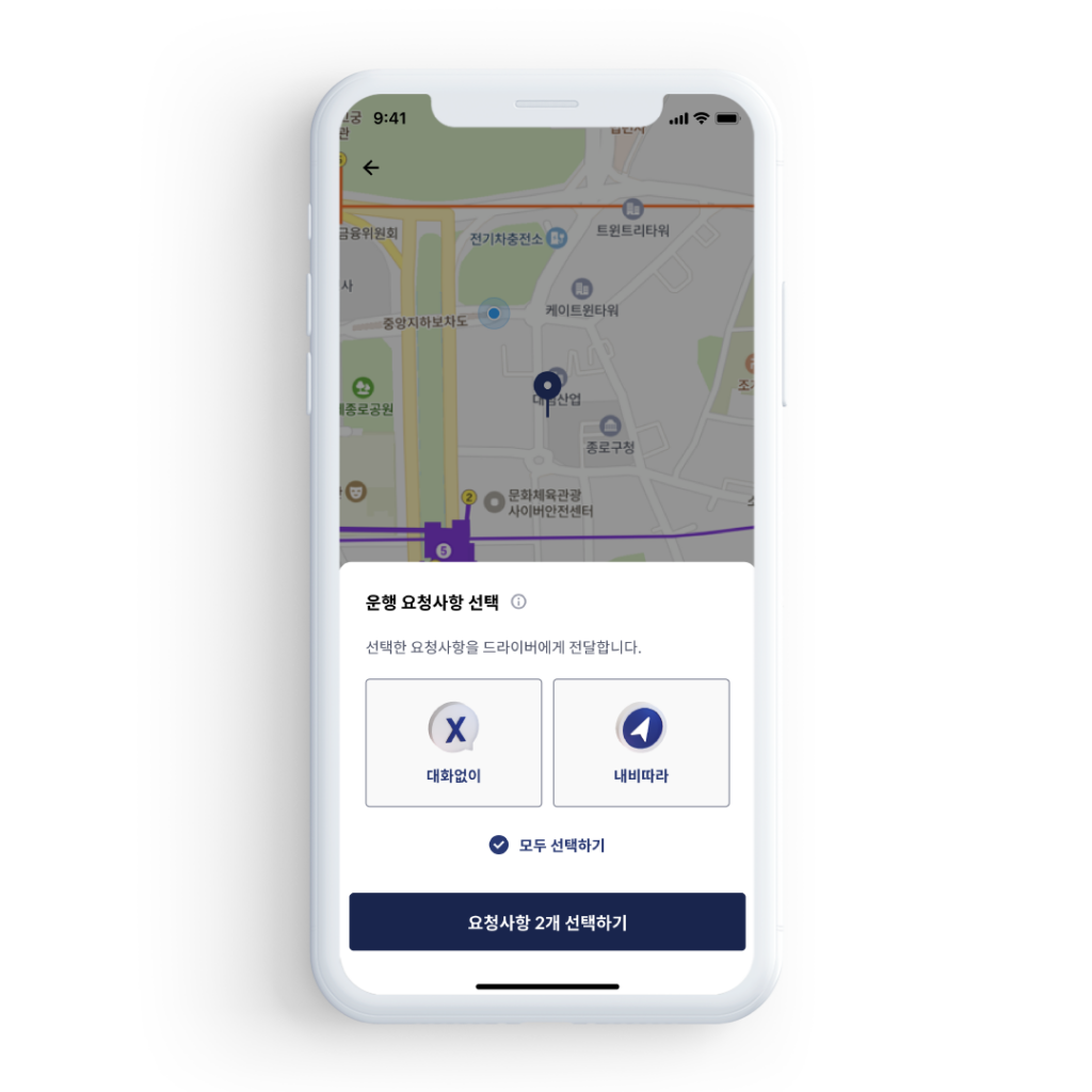 '사전운행 요청하기'는 택시를 호출할 때 ‘대화 없이 이동하기’나 ‘내비게이션에 따라 운행하기’와 같이 이용자의 요청 사항을 앱에서 선택해 미리 요청할 수 있도록 만든 편의 기능이다.