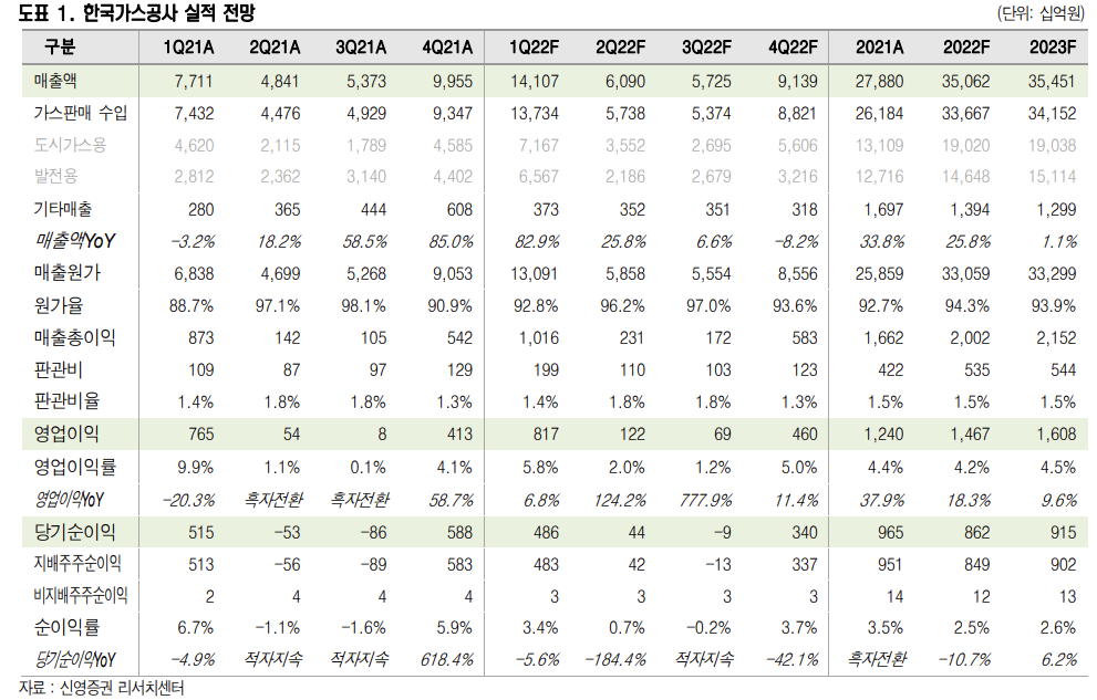 연간 매출액은 전년 대비 25.8% 증가한 35조원을, 영업이익은 1조5000억원으로 4.2% 늘어날 것으로 추정된다. 운전자금 증가는 요금 기저 상승으로 이어지기 때문에 적정 투자보수는 전년 대비 증가할 가능성이 클 것으로 보인다. 자기자본 보수율은 금리가 상승하는 반면 베타가 감소함에 따라 전년과 유사할 것으로 예측된다.