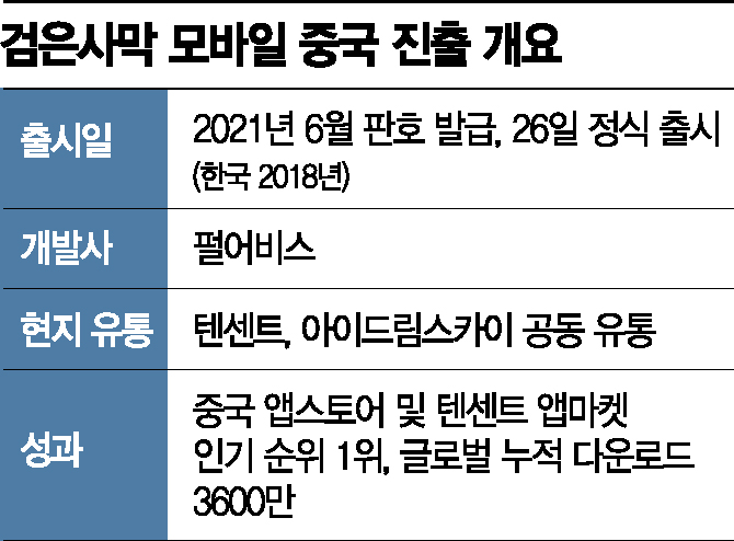 [아시아경제 이승진 기자] 펄어비스의 ‘검은사막 모바일’이 중국 시장에 정식 출시했다. 2017년 고고도미사일방어체계(THAAD·사드) 사태 이후 한국 게임이 중국에서 판호를 받아 정식 출시하는 첫 사례다. 인기(다운로드) 순위 1위에 오르며 기대를 모았지만 매출 기준으로는 31위를 기록해 아쉬움을 남기고 있다.