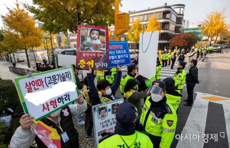 입양한 16개월 여아 정인이를 학대 끝에 숨지게 한 혐의를 받는 양부모의 항소심 결심공판일인 지난해 11월 5일 서울 서초구 서울중앙지방법원 앞에서 시민들이 피켓을 들고 있다./강진형 기자aymsdream@
