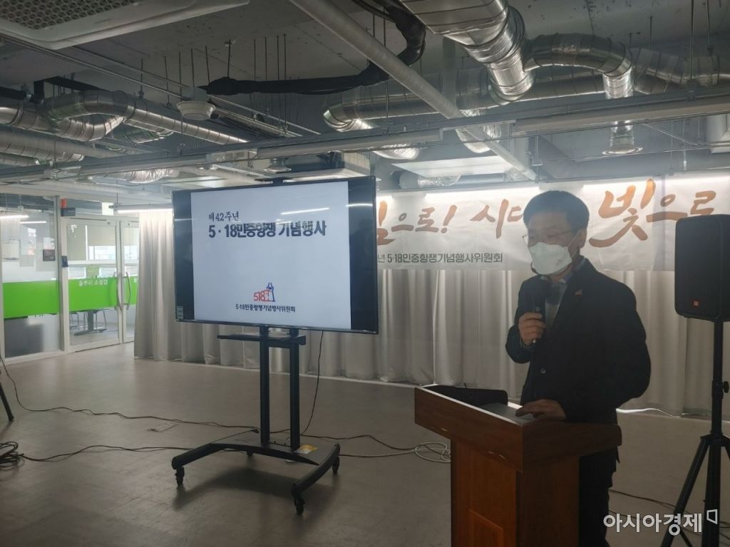 변재훈 민중항쟁 기념행사 집행위원장이 광주광역시 동구 금남로 전일빌딩245 4층에서 기자회견을 열고 이번 기념행사의 전반적인 계획을 설명하고 있다.