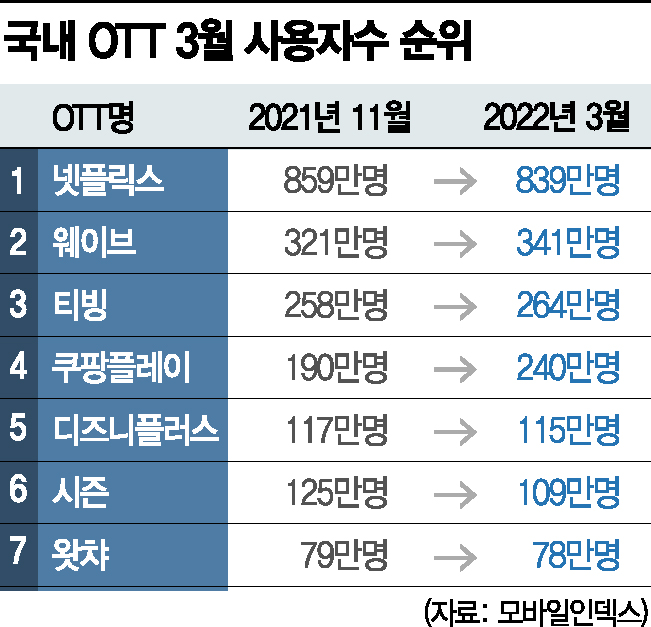 재택근무 종료, 사적 모임 인원과 영업시간 제한 해제 등 일상회복이 본격화되면서 전체 OTT 가입자수 및 이용자수는 감소세로 전환하고 있다. 여러 개의 OTT를 동시 가입하는 사람들도 줄고 있다. 매월 가입한 OTT 서비스를 바꿔가며 시청하는 등 충성 고객 확보도 쉽지 않은 상황이다.
