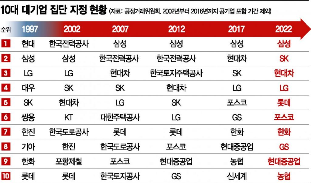9일 공정거래위원회 기업집단포탈 등에 따르면 대규모기업집단제 도입(1986년) 이후 통계를 집계할 수 있는 1997년부터 올해까지 25년 간 대기업집단 상위 10위권을 지키고 있는 그룹은 삼성, SK, 현대자동차, LG, 롯데, 한화, GS(분할), 현대중공업(분할) 등이다. 1997년 30대 대규모 기업집단 목록에 올랐던 이름의 절반이 지금은 역사의 뒤안길로 사라졌다. 당시 10대 그룹이었던 대우, 쌍용, 기아 등 3곳은 인수합병되거나 해산되는 운명에 처했다.
