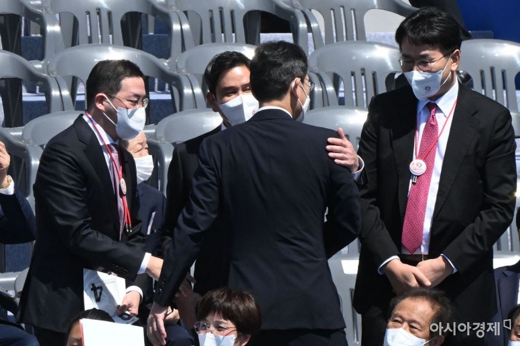 정용진 신세계 그룹 부회장이 10일 국회에서 열린 윤석열 제20대 대통령의 취임식에 참석해 이재용 삼성전자 부회장과 인사하고 있다./윤동주 기자 doso7@