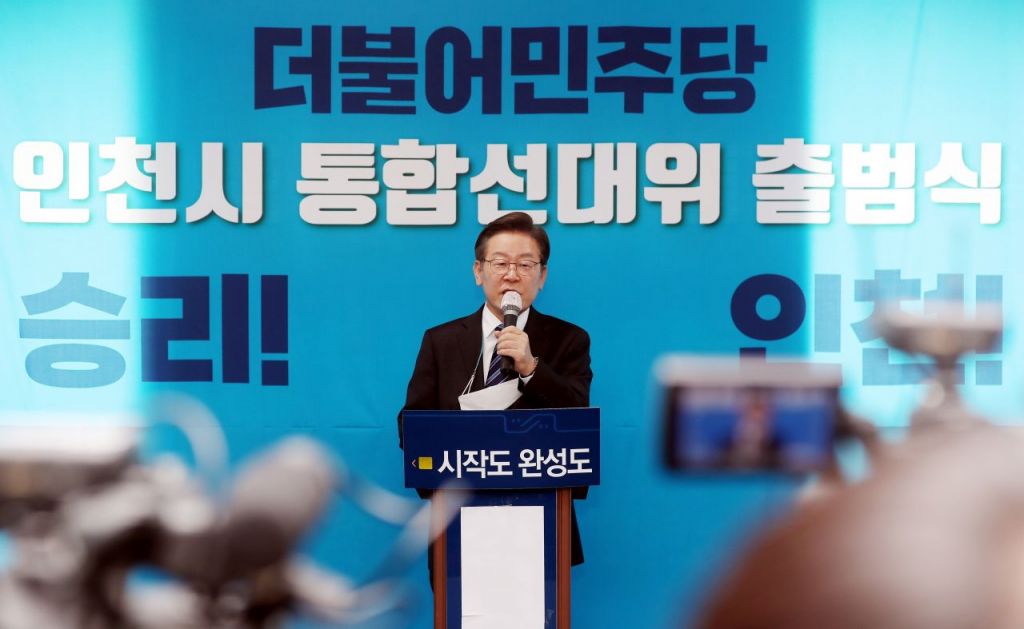 인천 계양을 국회의원 보궐선거에 출마한 이재명 더불어민주당 상임고문이 16일 오후 인천시 미추홀구 박남춘 인천시장 후보 선거사무소에서 열린 '6·1 지방선거 더불어민주당 인천시 통합선거대책위원회 출범식'에서 인사말을 하고 있다. [이미지출처=연합뉴스]