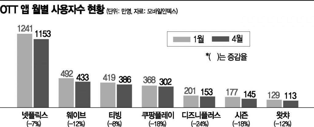 아이지에이웍스의 빅데이터 분석 솔루션 모바일인덱스에 따르면 지난달 OTT 모바일 월 사용자 수는 올해 1월보다 최대 24% 떨어졌다. 넷플릭스의 월별 사용자 수는 지난 1241만명에서 1153명으로 7% 줄었다. ‘오징어 게임’ 이후 신작 인기가 저조한 상황이다. 여기에 넷플릭스는 올해 요금을 20% 가까이 인상해 소비자들의 원성을 샀다. 웨이브는 492만명에서 433만명으로 12%, 티빙은 419만명에서 386만명으로 8% 감소했다. 사람들에게 가장 많이 외면받은 곳은 디즈니플러스다. 디즈니플러스 사용자수는 201만명에서 153만명으로 3개월만에 24% 급감했다.