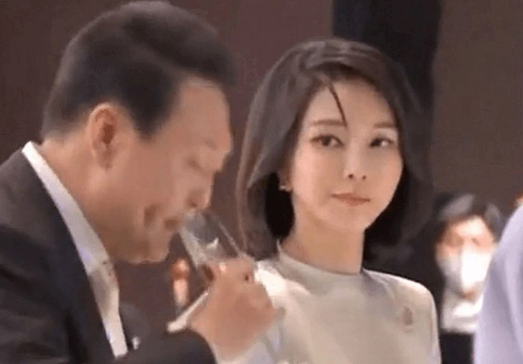 지난 10일 서울 중구 신라호텔 영빈관에서 열린 윤석열 대통령의 취임 기념 만찬장에서 김건희 여사가 윤 대통령을 향해 눈빛을 보내고 있다. 일각에서는 술을 즐기는 윤 대통령의 음주를 말릴 것 아니냐는 해석도 나왔다. 사진=온라인 커뮤니티 캡처