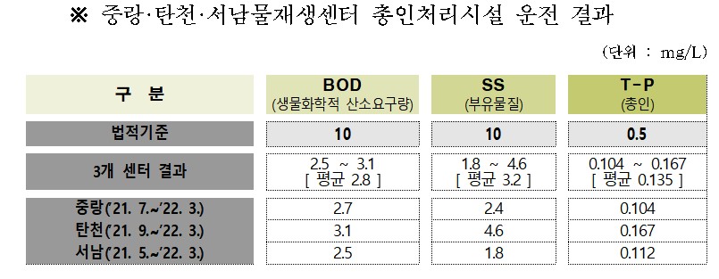 실제로 약 1년여 동안 3개 물재생센터에서 총인처리시설을 가동한 결과 총인 농도가 법정기준(0.5mg/ℓ)보다 73% 낮은 수치(0.104~0.167mg/ℓ, 평균 0.135mg/ℓ)로 나타났다. 또한 행주지점 기준 한강 본류 총인 농도도 2018년 0.105mg/ℓ에서 2022년 현재 0.053mg/ℓ로 감소했다.