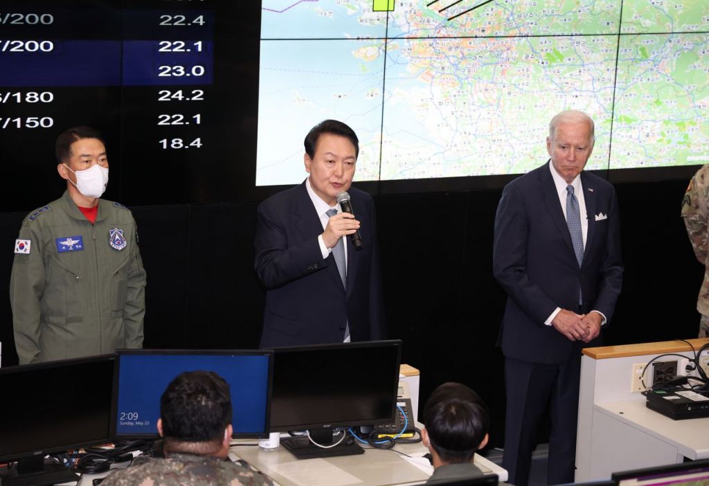 윤 대통령은 이날 오후 바이든 대통령의 방한 마지막 일정인 오산 공군기지 KAOC 방문 일정에 동행했다. 이번 방문에 우리 측 이종섭 국방부 장관, 김성한 대통령실 국가안보실장, 김태효 국가안보실 1차장 등이 동행했다. 미국 측에서는 라카메라 주한미군 사령부 대장, 스콧 플로이스 중장 등이 배석했다.