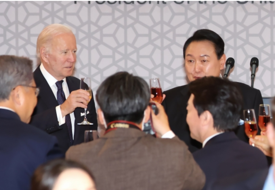 윤석열 대통령과 조 바이든 미국 대통령이 21일 오후 서울 용산 국립중앙박물관에서 열린 환영 만찬에서 건배하고 있다. 오른쪽 아래가 안철수 전 대통령직 인수위원장. [이미지출처=연합뉴스]