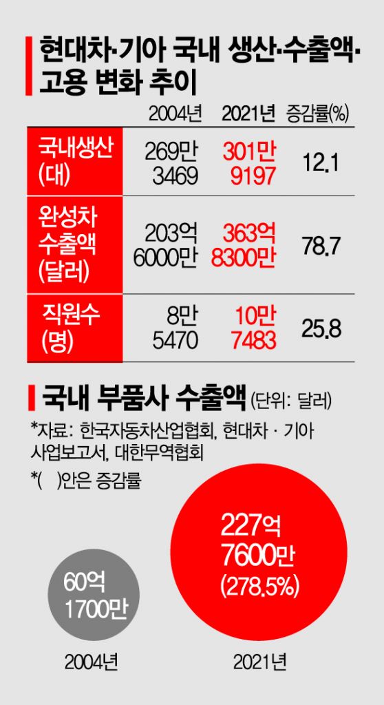 국내 업체들의 해외 진출도 활발해졌다. 748개사에 달하는 1·2차 협력업체들이 현대차그룹과 함께 해외에 동반 진출했다. 그 결과 협력업체 평균 매출액은 2004년 979억원에서 2020년 3196억원으로 3.3배, 자산규모는 702억원에서 2612억원으로 3.7배 늘었다.