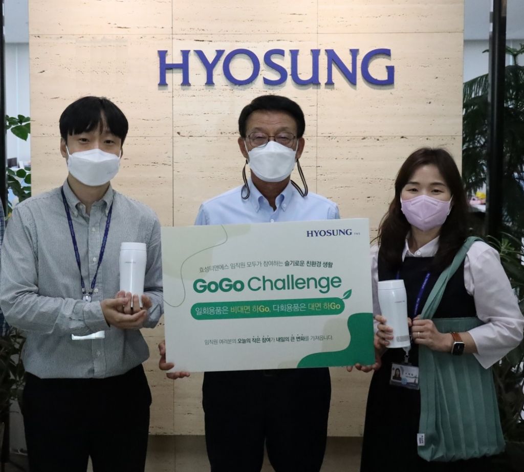 효성티앤에스는 사내 공모를 통해 '일회용품은 비대면하Go, 다회용품은 대면하Go' 슬로건으로 선정하고 적극적인 실천을 다짐하는 자리를 가졌다. 전 임직원을 대상으로 텀블러와 효성의 친환경원사로 만든 에코백을 제공해 다회용 물품 사용을 생활화할 방침이다. 불필요한 서면 결재를 전자 결재로 대체하는 등 환경친화적인 사무환경을 조성해 자원낭비를 줄일 예정이다.