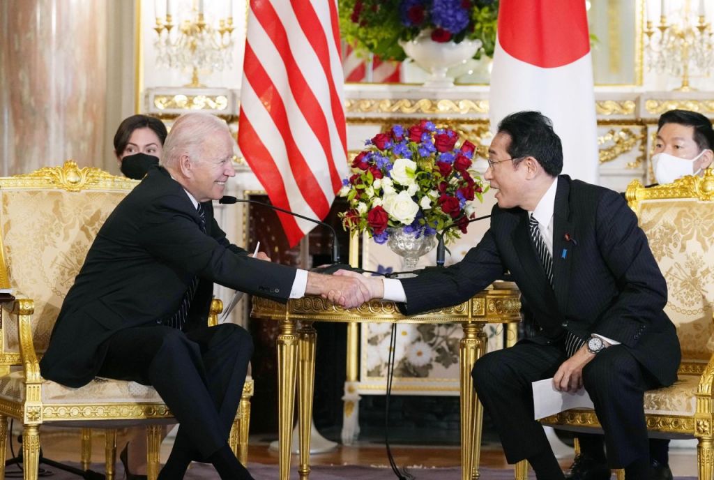 조 바이든 미국 대통령(왼쪽)과 기시다 후미오 일본 총리가 23일 오전 일본 도쿄 소재 영빈관에서 개최된 정상회담에서 악수를 하고 있다. 사진=연합뉴스