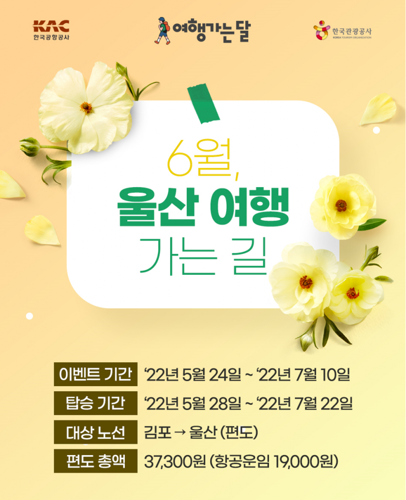 [아시아경제 최대열 기자] 에어부산은 24일부터 오는 7월 10일까지 김포에서 출발해 울산으로 가는 항공권을 3만7300원에 팔기로 했다고 밝혔다. 지역관광 활성화 목적으로 한국관광공사·한국공항공사와 함께 하는 프로모션이다. 1인 편도 기준 금액으로 공시 운임보다 50% 이상 할인된 가격이다. 탑승기간은 5월28일부터 7월22일까지다.