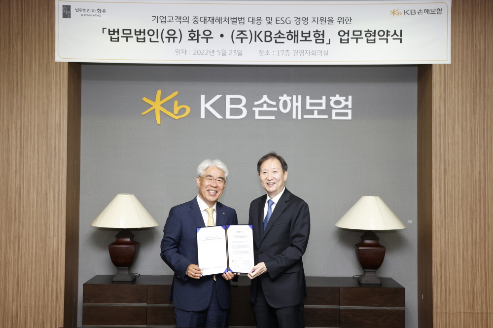 KB손해보험(대표이사 사장 김기환)은 23일 오후, KB손해보험 김기환 사장(좌측)과 법무법인 화우 정진수 대표변호사(우측) 및 관련 임직원들이 참석한 가운데 기업의 중대재해처벌법 대응 지원을 위한 업무협약(MOU)을 체결했다.(사진제공 : KB손해보험)