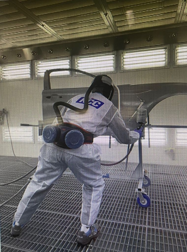 전기자동차 보수용 도장의 마지막 단계인 '클리어 도장'을 하고 있는 도장기술자. [사진제공=KCC]