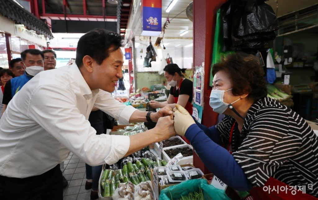 오세훈 국민의힘 서울시장 후보가 24일 서울 구로구 고척중앙시장을 방문, 상인들과 인사를 나누고 있다./윤동주 기자 doso7@