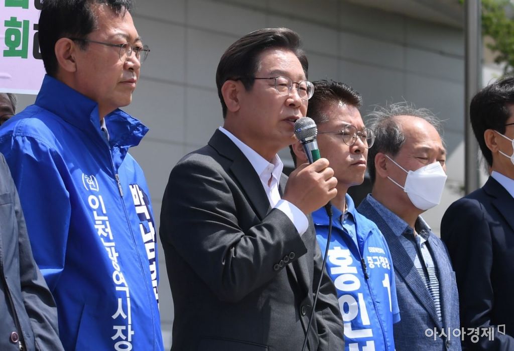 이재명 더불어민주당 인천 계양을 재보궐 국회의원 후보가 26일 인천 계양역 광장에서 열린 '공항 철도 전기 수도 민영화 반대 기자회견'에 참석, 발언을 하고 있다./국회사진기자단
