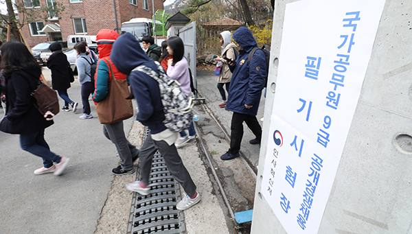 종로구 경복고등학교에서 9급 공무원 필기시험을 마친 수험생들이 나오고 있다. [이미지출처=연합뉴스]
