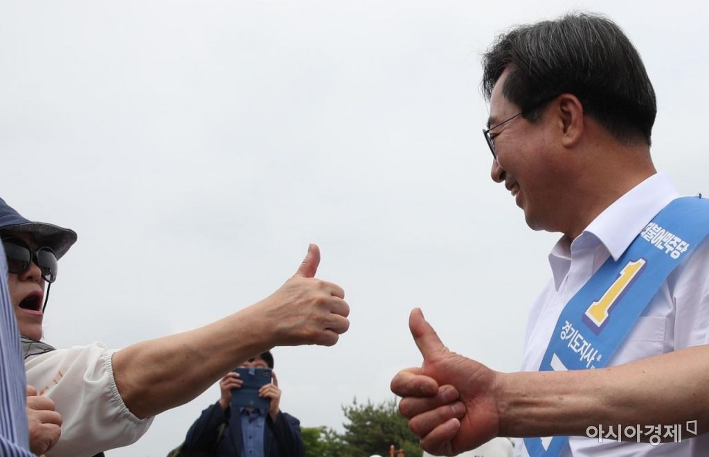 김동연 더불어민주당 경기도지사 후보가 29일 경기도 파주시 문산읍 임진각 평화누리공원에서 한 관광객에게 엄지척 지지를 받고 있다./윤동주 기자 doso7@