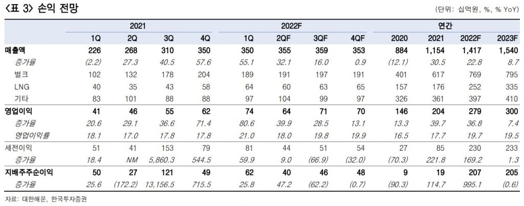 최고운 한국투자증권 연구원은 "새로운 성장동력으로 주목받았던 컨테이너선 사업(SM상선)은 다른 계열사로 넘어갔으나 그 빈 자리를 LNG선이 채워나갈 것"이라며 "벌크해운 수급은 2023년까지 구조적으로 개선되며 LNG선 시장의 성장성 역시 커지고 있다는 점에서 불확실성보다 저평가 매력에 더 주목할 것을 권유한다"고 조언했다.