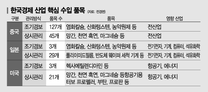반도체와 고강도 철강에 쓰이는 산화텅스텐의 중국 의존도는 무려 95%에 육박하고 자동차 생산에 필수적인 마그네슘잉곳은 전량 중국에서 수입되고 있는 형편이다. 중국이 ‘요소수 사태’ 당시와 같이 타 국가와의 무역 분쟁으로 수출 규제에 나설 경우 국내 산업 현장은 큰 타격이 불가피할 수밖에 없는 구조인 셈이다.