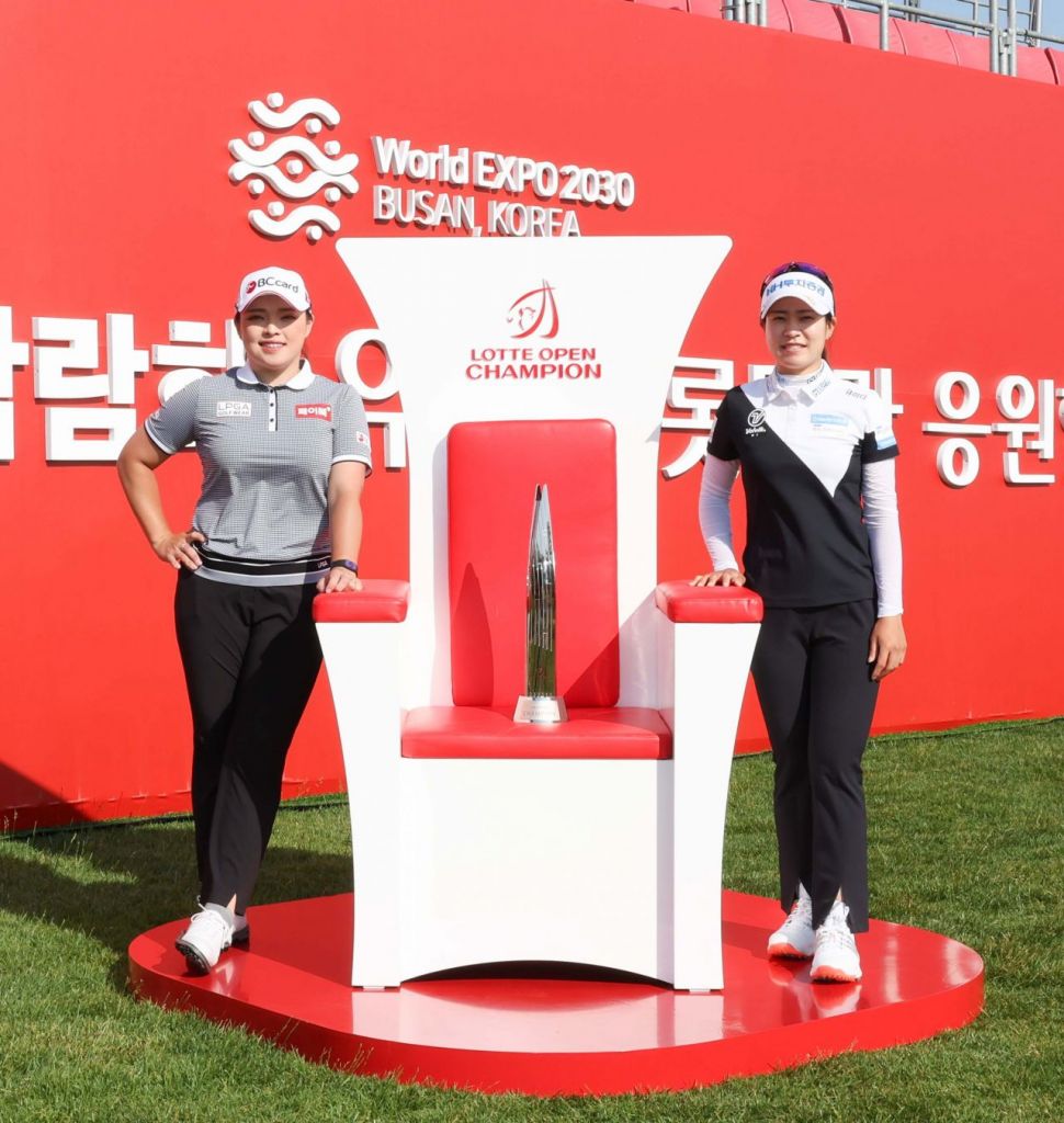 장하나(30ㆍ비씨카드ㆍ왼쪽)가 한국여자프로골프(KLPGA)투어 롯데오픈(총상금 8억원) 개막에 하루 앞서 1일 인천 베어즈베스트 청라골프장(파72· 6725야드)에서 열린 포토콜 도중 박민지(24·NH투자증권)와 함께 선전을 다짐하고 있다. 지난해 최종일 이븐파로 스코어를 지켜 공동선두(6언더파 282타)에 오른 뒤 18번홀(파4)에서 속개된 연장 첫번째 홀에서 유해란(20)을 제압한 ‘약속의 땅’이다. 사진제공=KLPGA