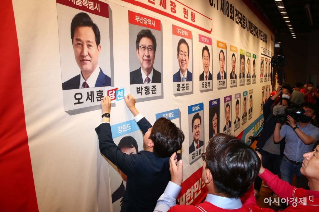 이준석 국민의힘 대표가 1일 국회 도서관 대강당에 마련된 개표상황실에서 당선 확신이 나온 후보자 사진에 '당선' 스티커를 붙이고 있다./윤동주 기자 doso7@