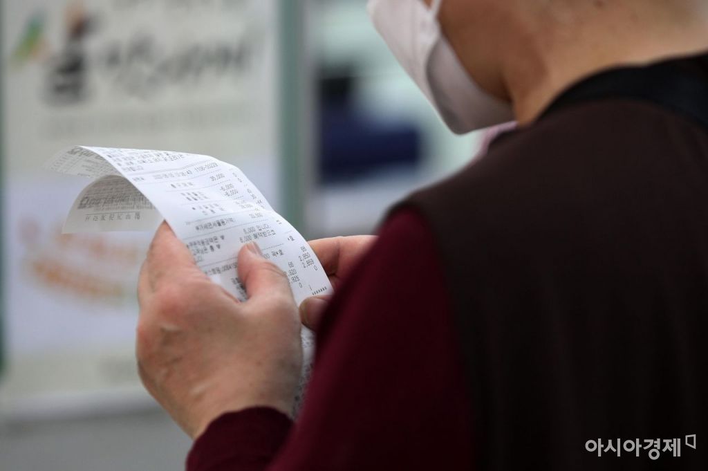 5일 서울의 한 대형마트에서 한 시민이 영수증을 살펴보고 있다. 지난달 소비자물가 상승률이 5%대를 넘어서는 등 최근 물가상황이 엄중한 가운데 우크라이나 사태, 주요 곡물생산국 수출 제한 등에 따른 국제 곡물가 급등이 국내로 전이되고 있다. 여기에 최근 가뭄피해까지 더해지며 일부 농축산물을 중심으로 생활물가가 불안한 양상을 보이고 있다./김현민 기자 kimhyun81@