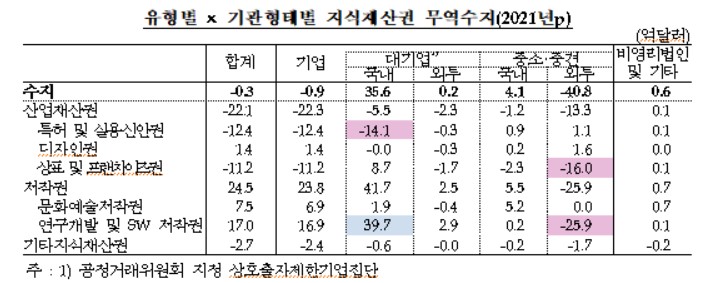 기업 경영과 직결되는 산업재산권 분야만 따로 떼어놓고 보면 더 심각하다. 산업재산권에는 △특허 및 실용신안권 △디자인권 △상표 및 프랜차이즈권이 포함되는데 지난해 22억1000만 달러 적자를 냈다. 특히 국내 대기업의 특허 및 실용신안권 무역수지는 14억1000만 달러 적자를 기록했다. 상표 및 프랜차이즈권은 외국인투자 중소·중견기업(-16억 달러)에서 적자였다.