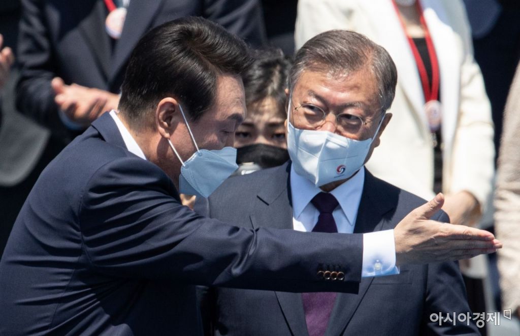 윤석열 대통령이 지난달 10일 국회에서 열린 제20대 대통령 취임식을 마친 후 문재인 전 대통령을 환송하고 있다./윤동주 기자 doso7@