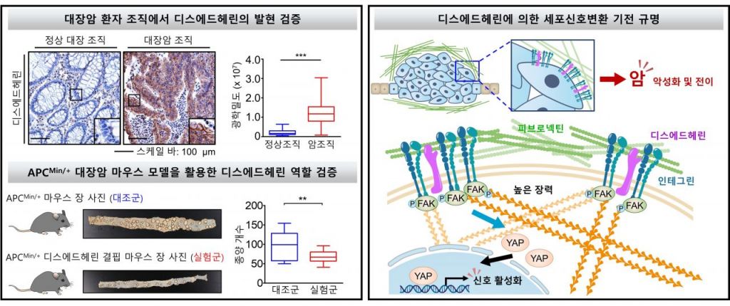 연구팀은 대장암 환자를 대상으로 한 조직 분석을 통해 같은 환자의 정상 조직보다 암 조직에서만 디스에드헤린의 발현이 특이적으로 높다는 것을 검증했다. 이를 기반으로 대장암 마우스 실험을 통해 디스에드헤린 녹아웃 마우스(특정 유전자가 제 기능을 하지 못하도록 만든 생쥐)에서 종양 형성 및 침윤 억제를 확인했다.