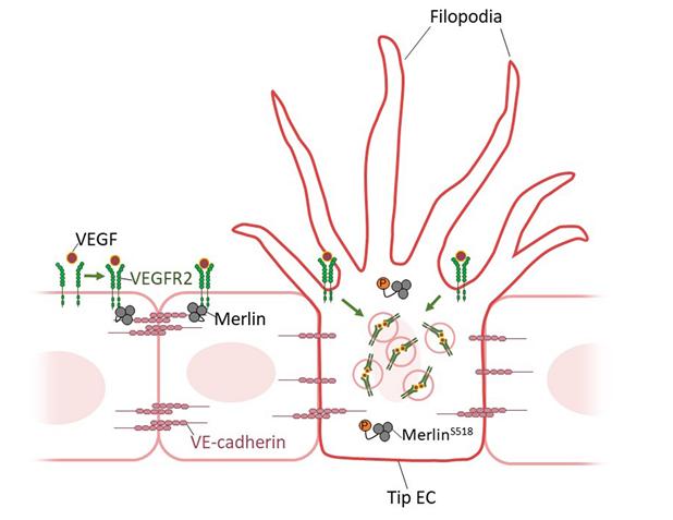 VE-Cadherin 밀도가 높은 혈관내피세포에서는 Merlin, VEGF 수용체와 VE-Cadherin이 서로 결합함으로써 VEGF 수용체의 세포 내 이동을 억제하지만, 반대로 VE-Cadherin 밀도가 낮을 경우 상호결합력이 약해져 VEGF 수용체의 세포 내 이동이 증가하여 VEGF 신호전달이 활성화되고, 첨단세포의 성장유도가 촉진되는 것을 확인했다. 이 현상은 망막 혈관뿐만 아니라 VEGF가 과발현되는 갑상선과 소장융모에서도 동일하게 확인됐고 생쥐 종양모델에서도 확인할 수 있었다. Merlin이 종양혈관에서 선택적으로 제거되었을 때 첨단세포 수는 증가하고 대세포 수는 줄어들었다. 이로 인해 비기능적 혈관이 과다하게 생성된 종양혈관은 혈액이 잘 흐르지 않는 비정상적인 혈관으로 변형되었으며, 혈중 산소 감소로 종양의 성장이 현저히 줄었다.