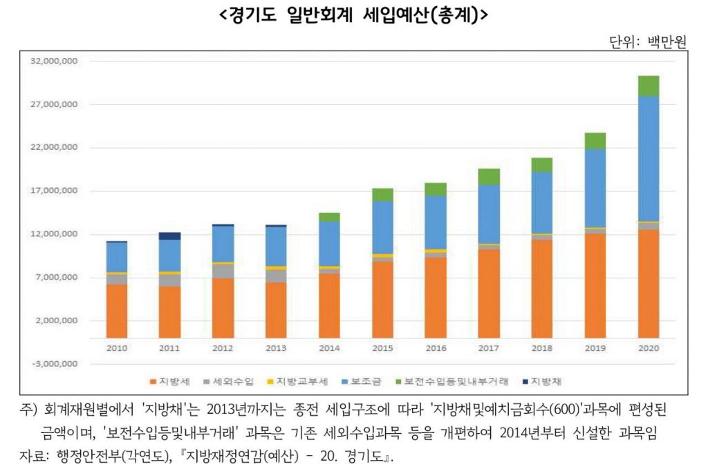 경기도의 경우 일반회계 예산 기준의 재정자립도(전체 재원 중 자주재원 비율)는 2009년 75.9%에서 2021년 63.7%로, 재정자주도(전체 세입 중 재량으로 사용할 수 있는 재원 비중)는 2009년 84.4%에서 2021년 73.7%로 각각 하락했다.