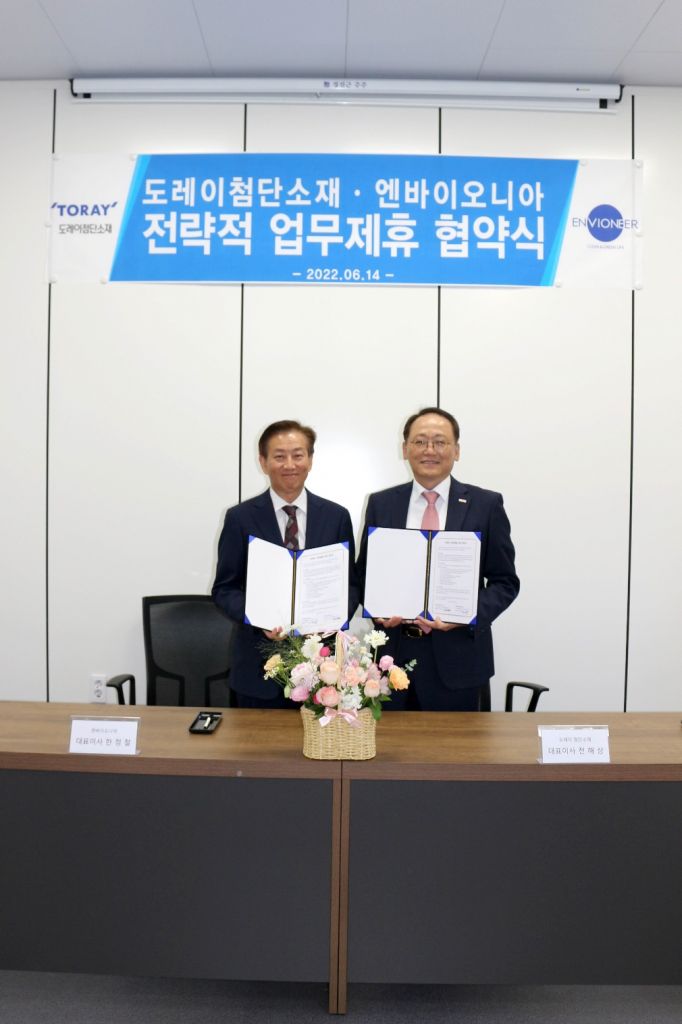 한정철 엔바이오니아 대표(왼쪽)과 전해상 도레이첨단소재 대표가 전략적 사업제휴를 맺은 후 기념촬영을 하고 있다.[사진제공=엔바이오니아]