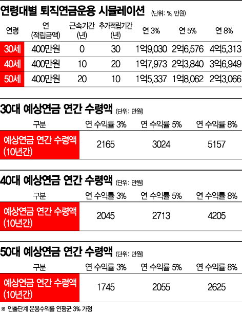 은퇴까지 30년 가까이 남은 30대는 퇴직연금 투자를 통해 적립식투자 및 장기투자 효과를 누릴 수 있다. 여기에 다양한 자산에 분산투자한다면 연 8% 수준의 공격적 투자가 가능하다. 연 8%로 투자 시 은퇴시점에 4억5313만원의 퇴직연금 확보 가능하며, 은퇴 후 10년간 연 5157만원씩 퇴직연금 수령 가능하다.