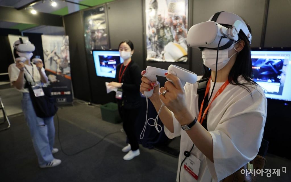 15일 서울 강남구 코엑스에서 열린 2022 메타버스 엑스포에서 방문객들이 VR체험을 하고 있다./김현민 기자 kimhyun81@