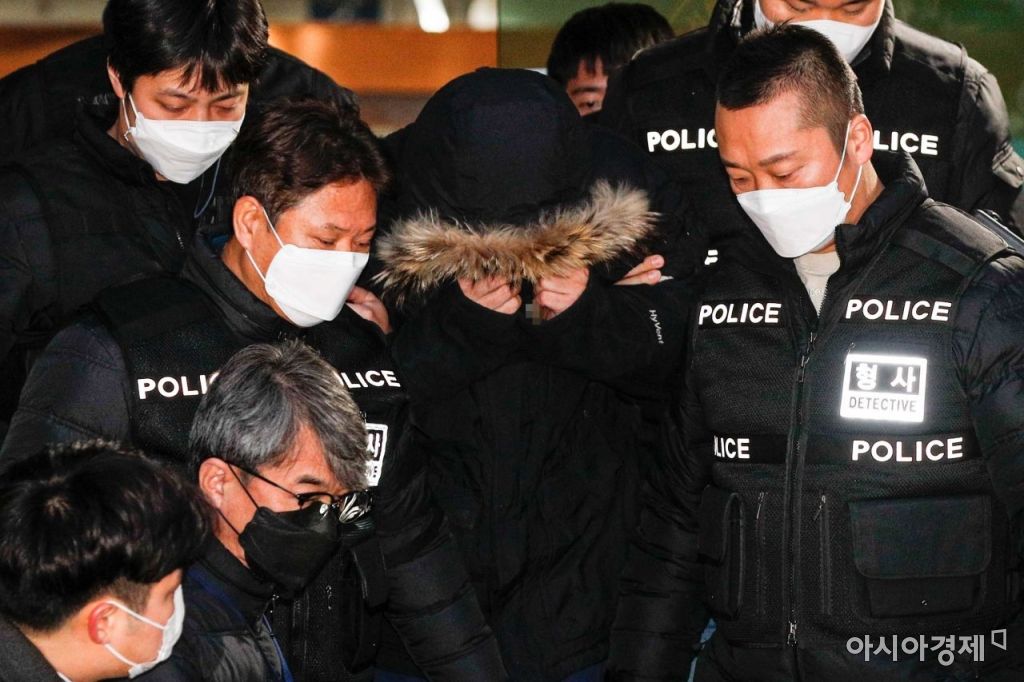 70cm 막대로 직원의 장기를 훼손해 살해한 혐의를 받고 있는 어린이 스포츠센터 대표가 7일 서울 서대문경찰서에서 검찰에 송치되기 위해 이동하고 있다./강진형 기자aymsdream@