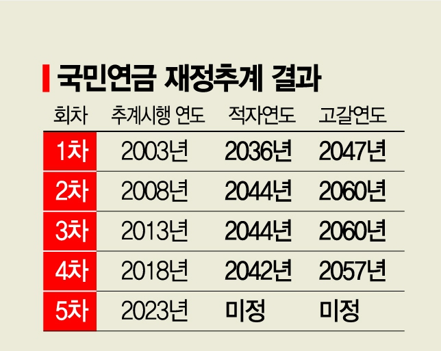 국민연금이 적자가 되는 연도와 기금이 완전히 고갈되는 연도는 갈수록 빨라지는 추세다. 2013년 3번째 점검 때만 해도 적자연도는 2044년, 고갈연도는 2060년이었다. 하지만 2018년 4번째 점검에서는 적자연도와 고갈연도가 각 2042년과 2057년으로 단축됐다. 보건복지부는 내년인 2023년 5차 점검결과를 내놓기 위해 평소보다 두 달 빠른 이달 ‘재정추계위원회’를 꾸릴 방침이다.