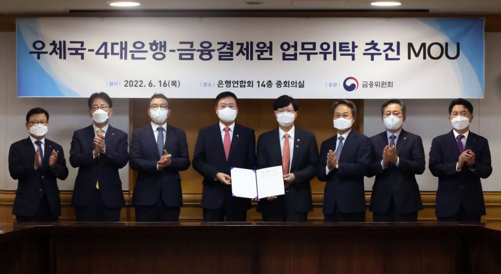 16일 김소영 금융위원회 부위원장은 우체국 업무위탁 확대를 위한 업무협약식을 주재하고 '은행권 오프라인 금융 접근성 제고방안'을 발표했다. 이날 우정사업본부, 4대 시중은행, 금융결제원은 업무협약을 체결하고 우체국에 대한 은행의 입·출금 등 업무위탁을 연내 서비스 제공을 목표로 원활하게 추진해 나가기로 했다.